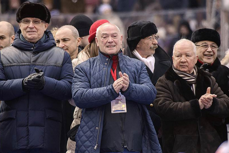 На опубликованном кадре Максом Барских изображены россияне с государственными флагами, а по центру люди держали желтый "противопутинский" плакат.