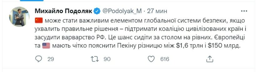 Подоляк также добавил, что европейцы и американцы должны четко объяснить Пекину разницу между $1,6 трлн и $150 млрд.
