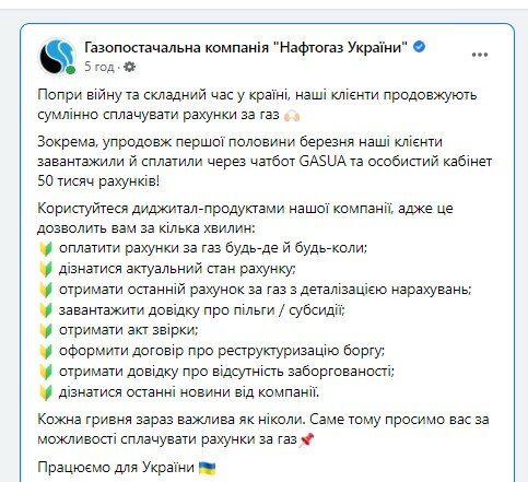 Так, за первую половину марта через чатбот GASUA клиенты Нафтогаза загрузили и оплатили 50 тысяч счетов.