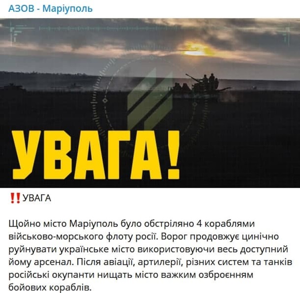 В воскресенье днем, 20 марта, Мариуполь обстреляли четыре корабля военно-морского флота РФ. Об этом сообщает полк Азов в Telegram.