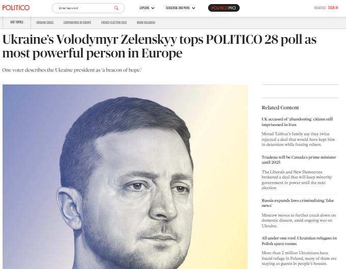 «Его сообщения (регулярные видео в соцсетях и видеоречи в парламентах многих стран) помогли изменить характер дебатов в европейских столицах, повлекшие такие изменения в правительственной политике, которые были немыслимы всего несколько месяцев назад», - говорится в сообщении издания.