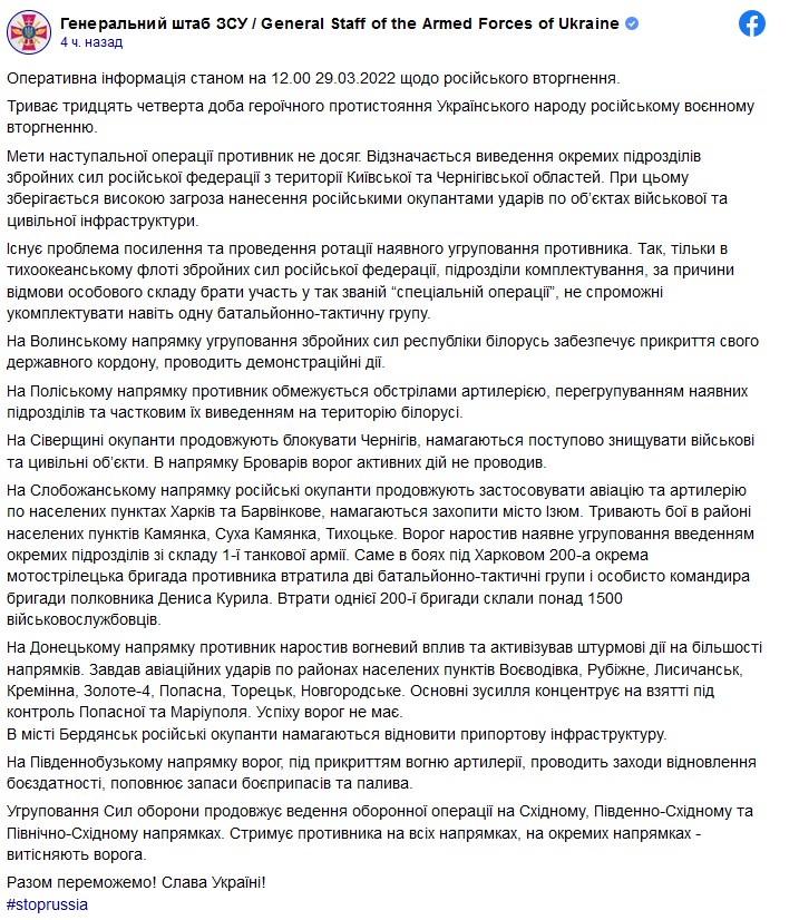 "Существует проблема усиления и проведения ротации имеющейся группировки противника. Так, только в Тихоокеанском флоте вооруженных сил Российской Федерации подразделения комплектования по причине отказа личного состава участвовать в так называемой "специальной операции" не способны укомплектовать даже одну батальонно-тактическую группу", – говорится в сообщении.