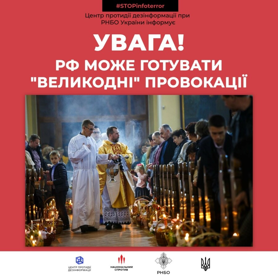 В Центре противодействия дезинформации при СНБО Украины предупреждают о возможных провокациях россиян в Пасхальную ночь, в частности в Запорожской, Николаевской, Одесской, Сумской и Харьковской областях.