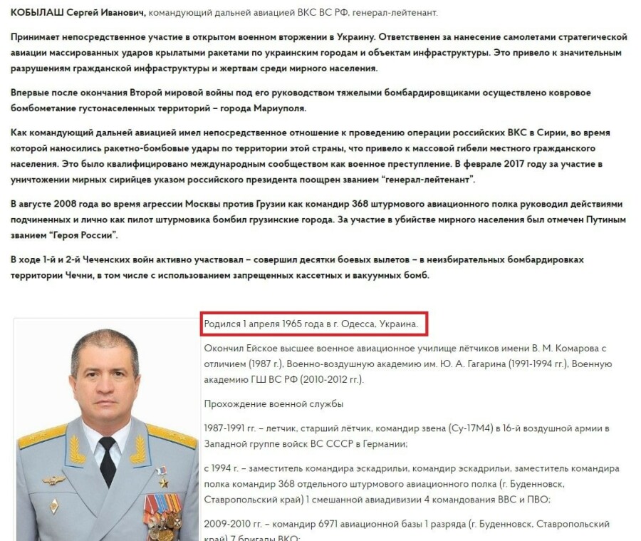 По данным разведчиков, генерал-лейтенант командующий авиацией ВКС рф Сергей Кобылаш, родившийся в Одессе, причастен к убийству мирного населения в Грузии и Сирии.