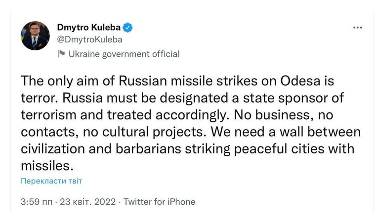 Кулеба уверен, что мир должен расторгнуть любое сотрудничество с Кремлем. "Россию нужно признать государством-спонсором терроризма и обращаться с ним соответствующим образом. Ни бизнеса, ни контактов, ни культурных проектов. Нам нужна стена между цивилизацией и варварами, поражающими мирные города ракетами", – пишет Кулеба.