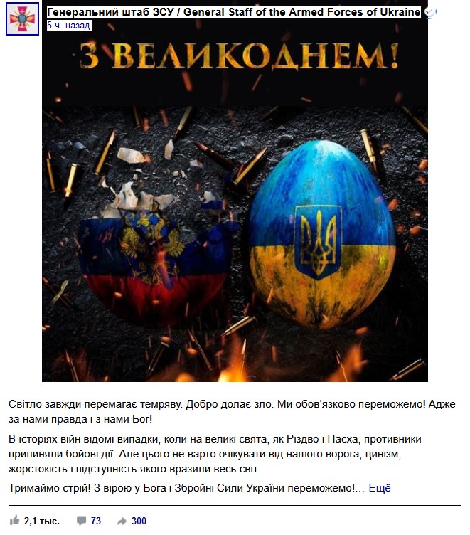 "Свет всегда побеждает тьму. Добро преодолевает зло. Мы обязательно победим! Ведь за нами правда и с нами Бог! В историях войн известны случаи, когда по большим праздникам, как Рождество и Пасха, противники прекращали боевые действия. Но этого не стоит ожидать от нашего врага, цинизм, жестокость и коварство которого поразили весь мир", - также написали в пресс-службе Генштаба.