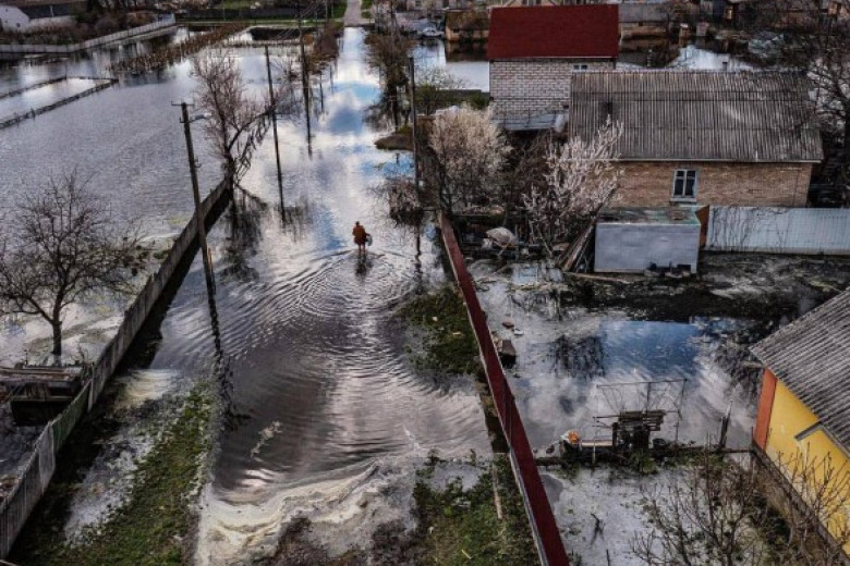 "Затопление села спасло Киев от оккупации. На фотографиях видно, как вода поглотила дома многих жителей села Демидова, что к северу от Киева", - написал министр.
