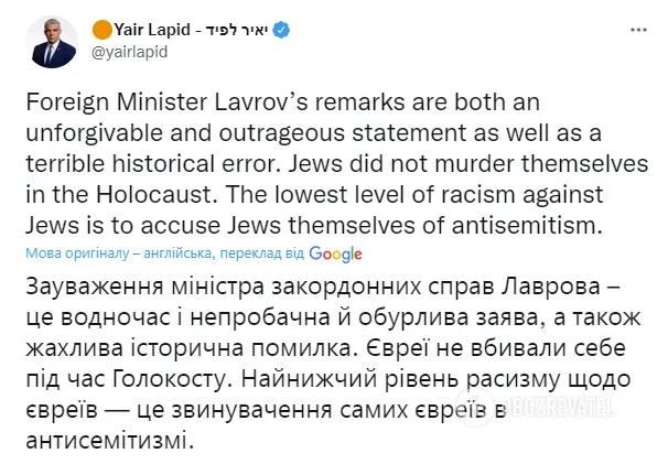"Высказывания лаврова не только непростительны и возмутительны – они также являются ужасной исторической ошибкой. Евреи не убивали себя во время Холокоста. Обвинение самих евреев в антисемитизме – это самый низменный уровень расизма в отношении евреев", – указал израильский министр.