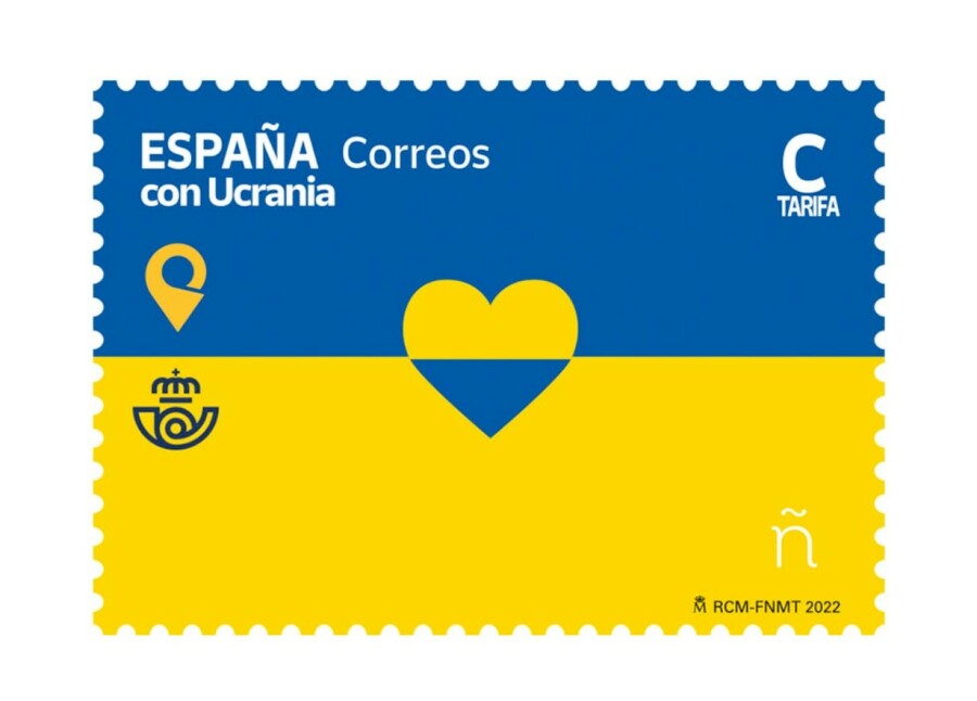 Она выполнена в цветах украинского флага, а в центре марки нарисовано сердце. В верхнем левом углу можно увидеть надпись "Испания с Украиной", а также логотипы Correos и Укрпочты.
