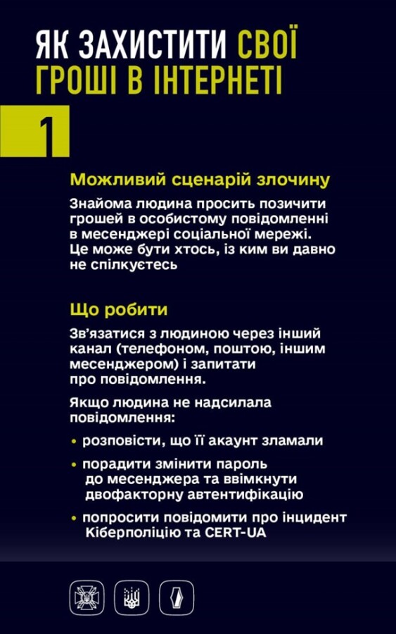 "Во время войны злоумышленники постоянно спекулируют на теме финансовой помощи украинцам, пострадавшим от действий России. Или просят средства якобы на помощь Вооруженным Сила, или пострадавшим от войны землякам или же для "получения" такой помощи выманивают данные карт, с которых потом снимают все деньги", - сообщают в МВД.
