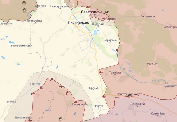 По его словам, российская армия полностью захватила Тошковку и пытается продавить оборону украинских войск между Долиной и Горским. Он отметил, что за Северодонецк продолжаются ожесточенные уличные бои, которые идут не только в промзоне города.