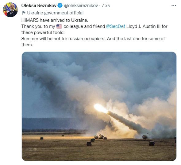 Министр сообщил о прибытии РСЗО HIMARS в Украину поблагодарил главу Пентагона Ллойда Остина "за эти мощные инструменты".