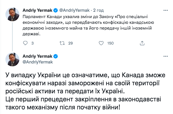 Глава Офиса президента Украины Андрей Ермак отреагировал в Twitter на законодательную инициативу Канады следующим образом: «В случае Украины, это означает, что Канада сможет конфисковать замороженные на своей территории российские активы и передать их Украине. Это первый прецедент закрепления в законодательстве такого механизма после начала войны».