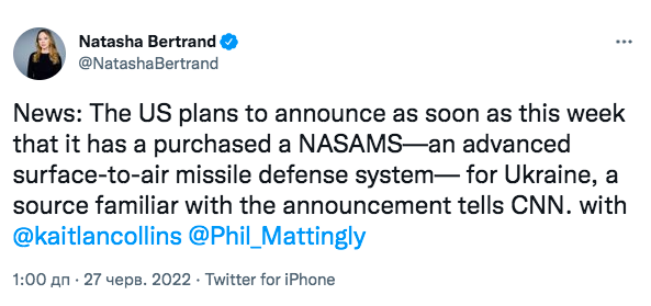 «США планируют объявить уже на этой неделе, что они приобрели NASAMS – передовую систему противоракетной обороны «земля-воздух» – для Украины, сообщает CNN источник, знакомый с объявлением» — написала Бертран в Twitter.