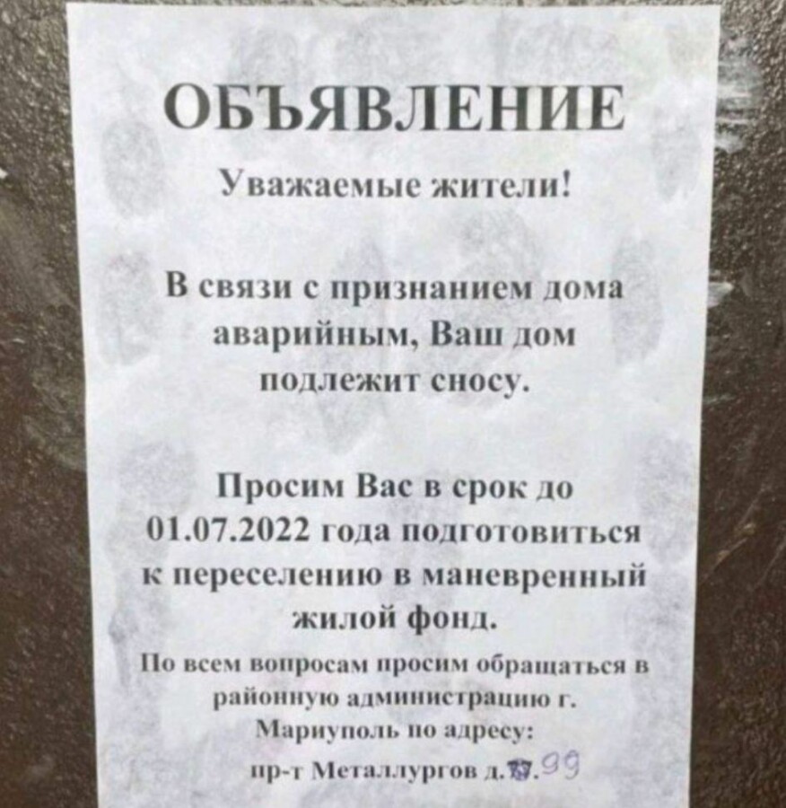 «С первого июля оккупационная «власть» начинает снос домов. Из-за возмущения людей городские коллаборанты прибегают к новым выдумкам. Такие сообщения размещают на домах, готовящих к выселению. «Маневренный жилой фонд» — это то, чего в Мариуполе нет. Фактически это означает — вас выселяют на улицу, вытаскивайте вещи и идите куда хотите», — заявил он.