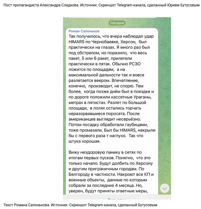Еще один российский блогер Роман Сапоньков сообщил, что лично видел эффективность ударов HIMARS по штабу ВС РФ во временно оккупированной Чернобаевке (Херсонская область).