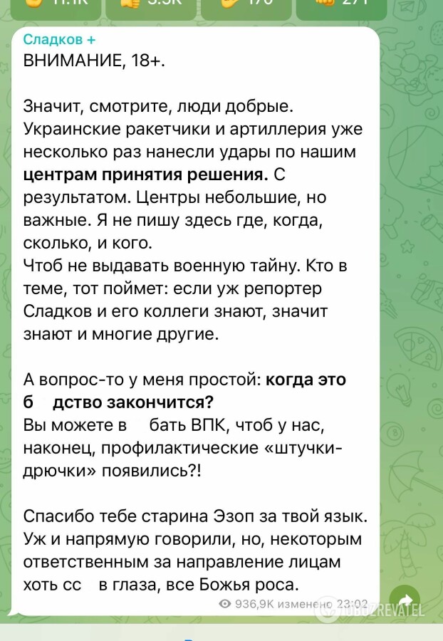 В частности, пропагандист Александр Сладков вдруг испугался, что украинские HIMARS накроют его вместе с очередным "центром принятия решений". В своем посте россиянин задал вопрос: "Когда это бл**ство закончится?"