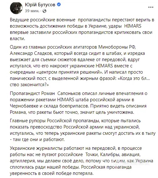 На это обратил внимание украинский журналист Юрий Бутусов. На своей странице в Facebook он отметил, что работа HIMARS впервые заставила прокремлевских "экспертов" критиковать свои власти.