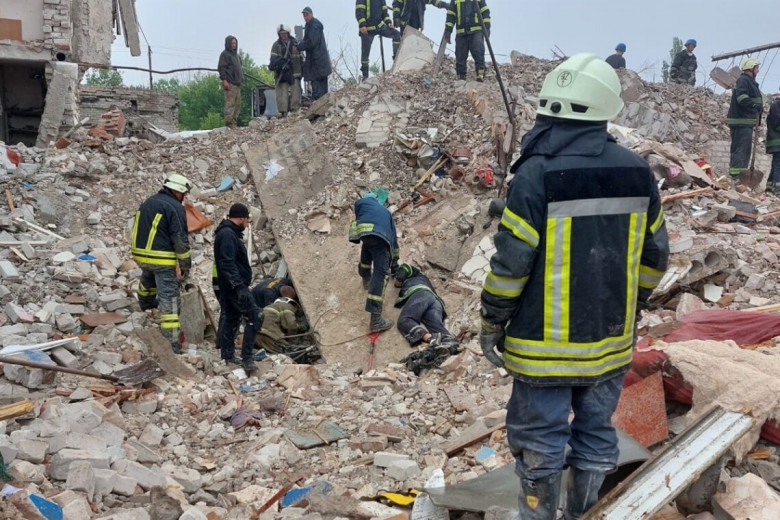 Дословно: "Из-под завалов разрушенного в результате обстрела 5-этажного жилого дома в г. Часов Яр извлекли тела 38 погибших, из них 1 ребенок (мальчик около 9 лет), спасены из-под завалов 9 человек, проведена расчистка и разбор более 400 тонн разрушенных элементов дома работы продолжаются".