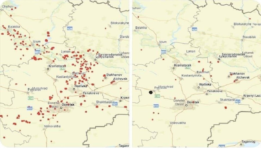 При сравнении карт наглядно видно, что количество обстрелов существенно сократилось.