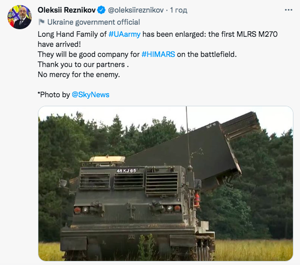 «В семействе дальнобойного вооружения ВСУ пополнение: прибыли первые РСЗО M270! Они станут хорошей компанией для HIMARS на поле боя. Спасибо нашим партнерам. Нет пощады врагу», — отметил Министр обороны.