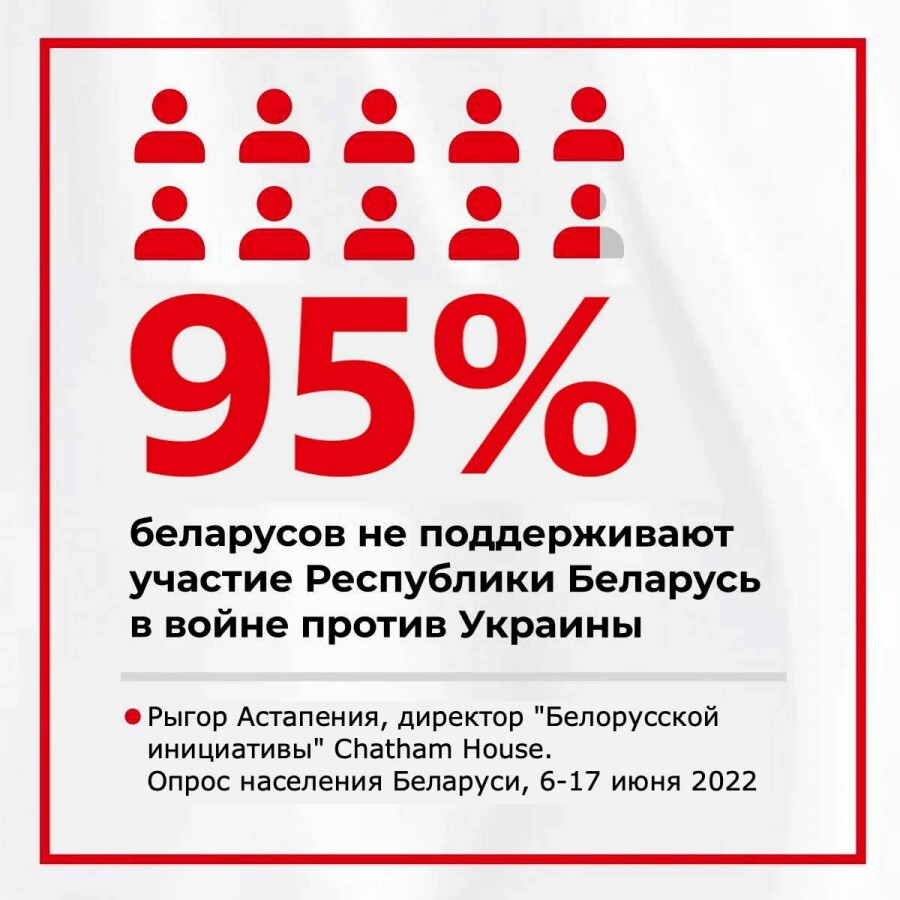 А людей, які вважають, що Білорусь має взяти участь у військових діях на боці росії, не багато – 5%», - каже директор «Білоруської ініціативи» Chatham House.