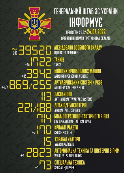Об этом говорится в сообщении Генерального штаба Вооруженных сил Украины, обнародованном утром 24 июля. Так, за пять месяцев войны потери России в войне достигли 39 тыс. 520 военных.