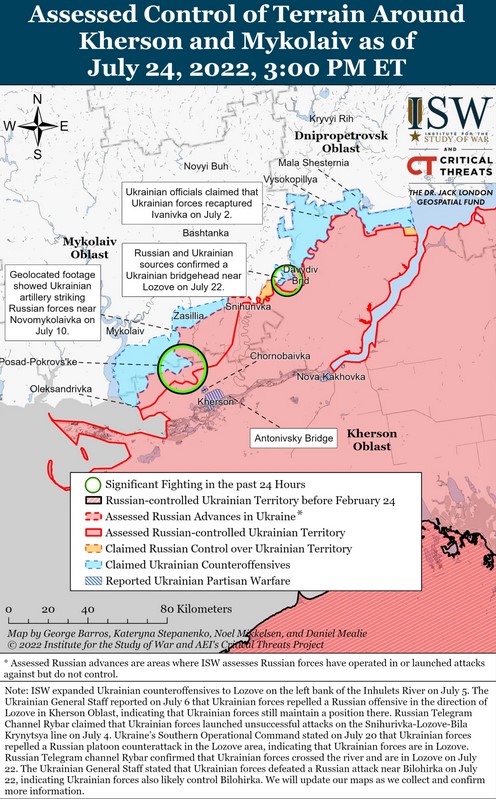 Помимо этого, в ночь с 23 на 24 июля украинские партизаны взорвали контролируемую Россией железную дорогу возле Новобогдановки Запорожской области, в 30 км к северу от Мелитополя. На фотографиях с места взрыва видны трещины на железнодорожном узле. Это, как заявили в ISW, может отрезать Васильевку и Токмак Запорожской области от главной железнодорожной линии в Мелитополь.