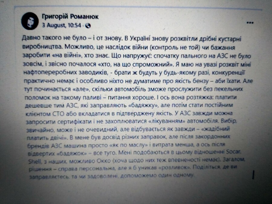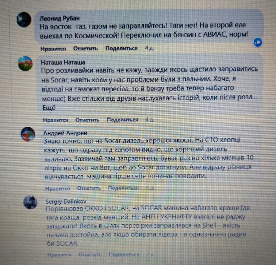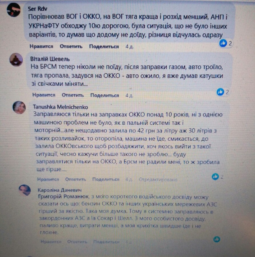 В одній з автомобільних груп на Facebook розгорнулася дискусія про якість пального на українських АЗС. За суб’єктивними враженнями користувачів автомобіль найкраще себе поводить після заправки на SHELL і SOCAR. Щодо ОККО думки розділилися – якістю пального задоволені не всі. На БРСМ і ANP більшість заправлятися не радить.