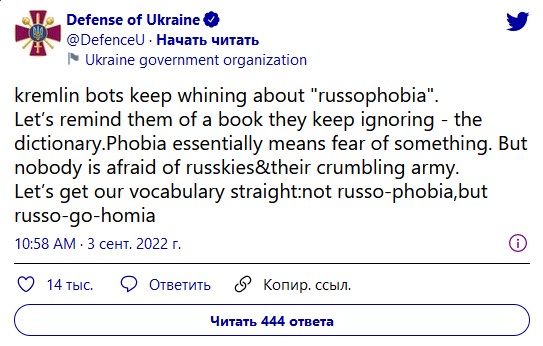 "Однако никто не боится россиян и их разваливающейся армии. Разберемся с нашей лексикой: не русофобия, а русо-гоу-хомия (от английского go home, идти домой. – Ред.)", – написали в Минобороны.