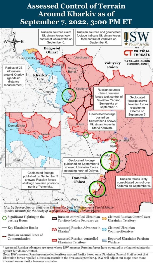 "Украинские силы продвинулись не менее чем на 20 км вглубь подконтрольной России территории к северу от Изюма в сторону Купянска и 6-7 сентября отбили около 400 квадратных километров. Российские источники утверждали, что украинские силы продвигались на юго-восток по трассам E40 и N26 в направлении Изюма и Купянска соответственно. По геолокации видно, что украинские силы также продвинулись на северо-восток по трассе Т2110 из Балаклеи, Вербовки, Яковенково, Волоховского Яра (на перекрестке Т2210 и Е40), а также в направлении Шевченково", - сообщили эксперты.