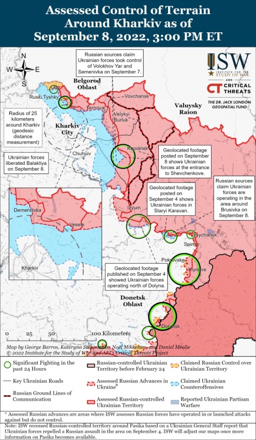 Украинские войска, вероятно, захватят Купянск в течение следующих 72 часов, серьезно ухудшив, но не полностью разорвав российские наземные линии связи (GLOC) с Изюмом".