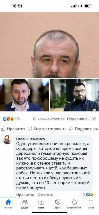 В комментарии под постом агент НАБУ Евгений Шевченко отметил: «Одно уточнение: они не «решалы», а мародёры, которые во время войны деребанили гуманитарную помощь! Так что по-хорошему не судить их нужно, а к стенке ставить и расстреливать нах*й, как бешенных собак. Но так как у нас расстрельной статьи нет, то их будут судить и я думаю, что по 10 лет тюрьмы каждый из них получит».