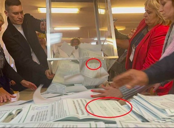 В сети появились фотографии, как российские оккупанты подсчитывают «голоса». На фото много пустых бюллетеней без отметок, но захватчики воспринимают такие бюллетени как утвердительный ответ.