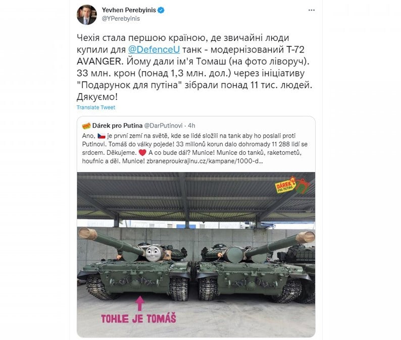 У межах ініціативи Dárek pro рutina («Останній подарунок для путіна»), чехи зібрали 1,3 мільйона доларів на модернізований танк Т-72 Avenger для потреб ЗСУ. Танк отримав назву “Томаш”. До збору коштів долучилися 11 288 людей.