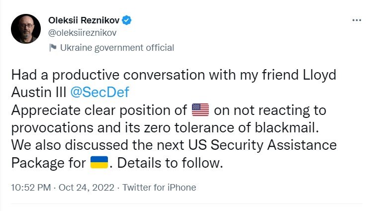 "Провел продуктивный разговор с моим другом Ллойдом Остином III. Ценю четкую позицию США по нереагированию на провокации и нулевую толерантность к шантажу", - проинформировал Резников.