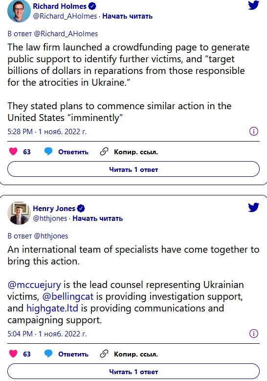 McCue Jury and Partners запустила краудфандинговую страницу для пожертвований на финансирование судебных расходов и команды экспертов. На странице сказано, что иск является частью более масштабной кампании «юридического противостояния гражданского общества, которую ведет международная группа юристов, следователей и активистов». Иск поддерживает команда расследователей Bellingcat.