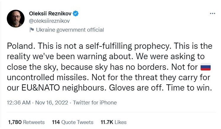 "Польша. Это не самоисполняющееся пророчество. Это реальность, о которой мы предупреждали. Мы просили закрыть небо, потому что у неба нет границ", - отметил министр обороны.