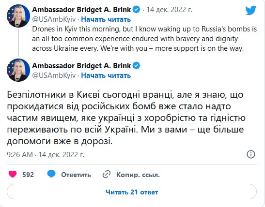 "Беспилотники в Киеве сегодня утром, но я знаю, что просыпаться от российских бомб уже стало слишком частым явлением, которое украинцы с храбростью и достоинством переживают по всей Украине. Мы с вами – еще больше помощи уже в пути", – написала Бринк в Twitter.