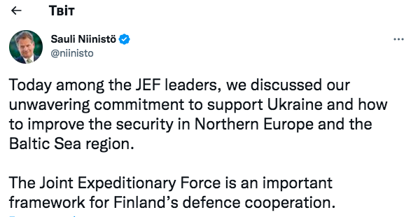 «Сегодня (19 декабря — «Флот 2017») среди лидеров «Объединенных экспедиционных сил» мы обсудили нашу твердую поддержку Украины, а также пути улучшения безопасности в Северной Европе и регионе Балтийского моря», — говорится в сообщении Ниинисте в Twitter.