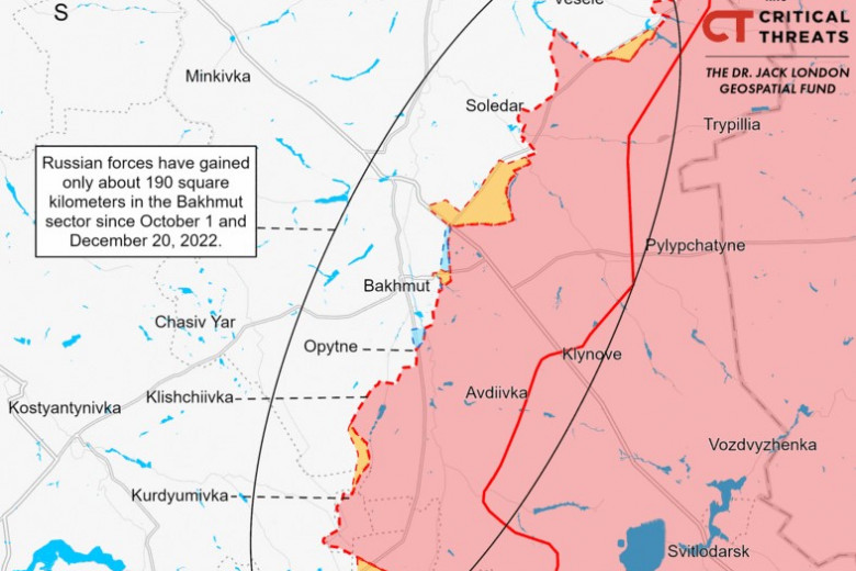 Американский Институт изучения войны (ISW) в очередной сводке пишет, что с 1 октября по 20 декабря россияне, в непрекращающихся боях смогли занять в окрестностях Бахмута территорию в 192 кв. км.
