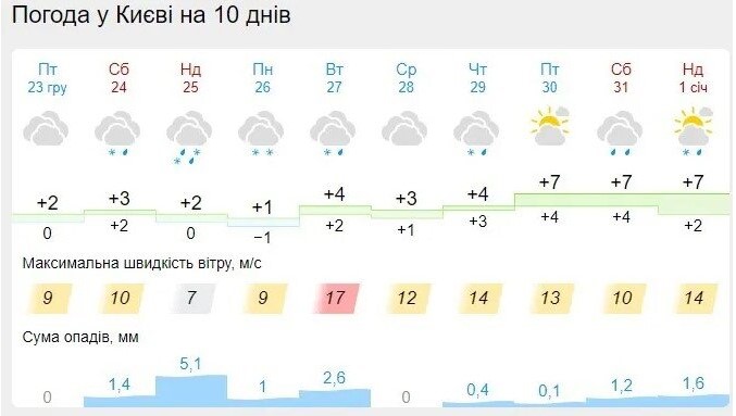 Подобный прогноз погоды публикует и сайт Gismeteo. Синоптики обещают температуру воздуха до +7 градусов 31 декабря и 1 января, а из осадков можно ожидать только дожди.