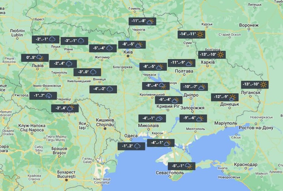 На юге Украины сегодня также ожидаются температурные контрасты. В Запорожье будет -6°, в Крыму, Херсонской и Николаевской областях столбики термометров покажут -1°, а в Одесской области воздух прогреется до +2° и вероятен мокрый снег.