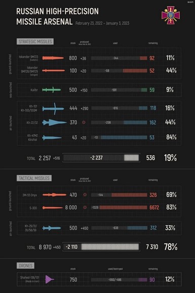 Напомним: 6 января министр обороны Украины Алексей Резников показал инфографику о том, сколько ракет использовала Россия, сколько произвела и сколько у нее осталось. Судя по этим данным, "Кинжалов" у страны-агрессора 53, "Искандеров" – 52, а ракет Х-22 и Х-32 – 162.