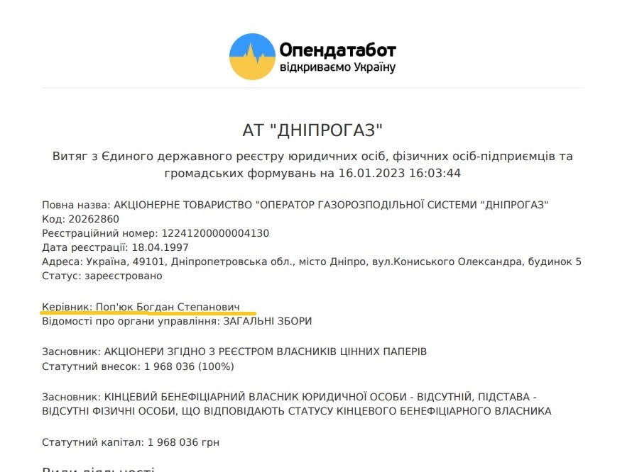 Як нам стало відомо з системи youcontrol, нещодавно вкотре було змінено голову правління АТ «Дніпрогаз». Попередній ставленик Дениса Миргородського, Поп’юк Богдан Степанович «пропрацював» на посаді близько 10 днів. Саме він в 2010 – 2013 роках Поп'юк був директором славнозвісної «Газ Украина 2020» та працював заступником керівника в «Лідергазі». Це компанії з імперії Сергія Курченка, який втік з країни в 2014 році.