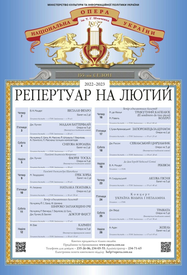 І, не зважаючи на те, що вистави все ще будуть лише «денні» (в четвер та п’ятницю в 17:00, а в суботу та неділю о 15:00), а кількість глядачів в залі дуже обмежена (лише 450 осіб), на прихильників оперного і балетного мистецтва очікують яскраві події. Це і зустріч із зіркою світової оперної сцени Людмилою Монастирською в титульній партії в опері «Флорія Тоска». Це і вистави, які з аншлагами пройшли на кращих майданчиках Франції та Японії під час офіційних гастролей трупи театру в цих країнах – балет «Жізель» та опера «Кармен». Це і шедеври української оперної та балетної класики – опери «Наталка Полтавка», «Запорожець за Дунаєм» та балет «Лісова пісня». Це і постановки сучасного бачення – опери «Севільський цирульник», «Травіата» та балети «Широко заплющені очі», «Доктор Фауст». А також концерти-присвяти - «Реквієм» Моцарта до Дня Героїв Небесної Сотні та «Україна вільна і незламна» до річниці широкомасштабного вторгнення країни-агресора на нашу землю.