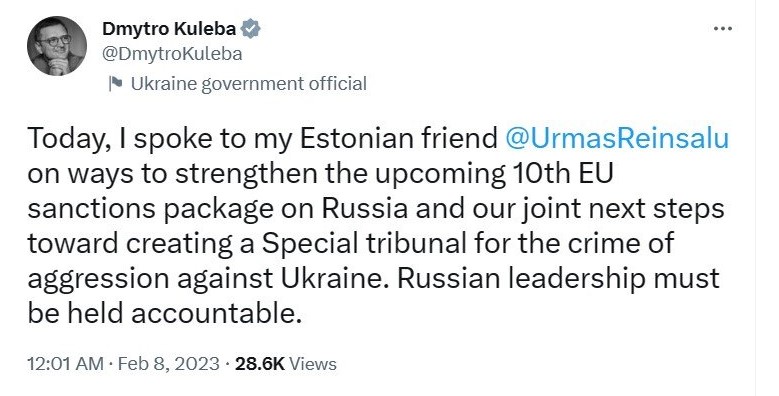 "Провел телефонный разговор с государственным секретарем США Энтони Блинкеном по поводу новой военной помощи, новых санкций против России и подготовки важных мер в контексте приближения годовщины полномасштабного вторжения РФ. Россия грубо ошибается, если думает, что кто-то устанет бороться со злом, которое она несет", – отметил Кулеба.