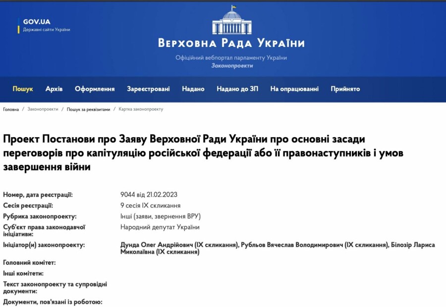 В Верховной Pаде появился проект постановления, согласно которому украинскому парламенту предлагается «принять заявление об основных принципах переговоров о капитуляции российской федерации или ее правопреемников и условиях завершения войны»