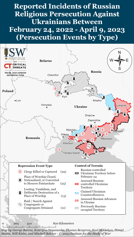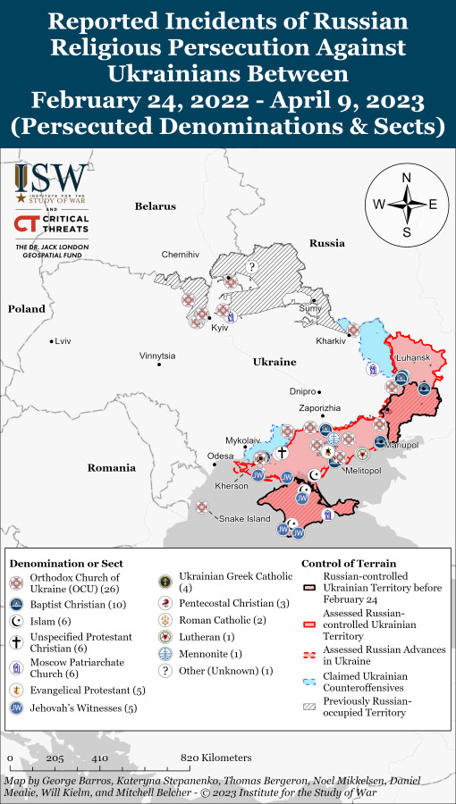 Систематические религиозные преследования в России поддерживают более масштабную российскую кампанию культурного геноцида против Украины. ISW ранее оценивала, что Россия проводит массовые депортации украинских детей и депопуляцию украинской территории, что, вероятно, равнозначно преднамеренной кампании этнических чисток. По оценке ISW, эта кампания этнических чисток является частью более масштабной кремлевской кампании культурного геноцида, направленной на искоренение представления об уникальной украинской культурной идентичности.