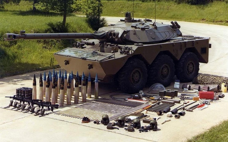 Основное вооружением AMX-10RC – 105-мм пушка F2 с электрогидравлической системой управления, установленная в трехместной турели. Из второстепенного вооружения имеется один 7,62-мм спаренный пулемет NF1 (4000 патронов), один 12,7-мм зенитный пулемет M2HB и четыре дымовых миномета GALIX.